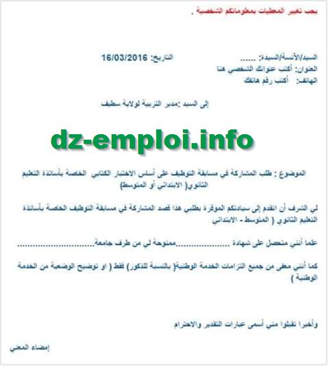 نموذج عن طلب خطي للمشاركة في مسابقة توظيف الاساتذة 2017 جديد مسابقات التوظيف