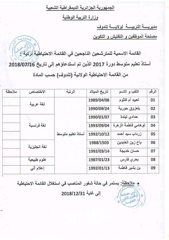 قوائم استدعاء احتياط مسابقة توظيف الاساتذة 2017 لولاية تندوف Onec Bem Bac